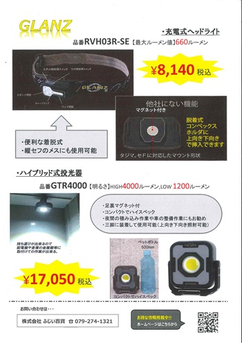 <GLANZ>充電式ヘッドライト RVH03R-SE/<GLANZ>ハイブリッド式投光器 GTR4000